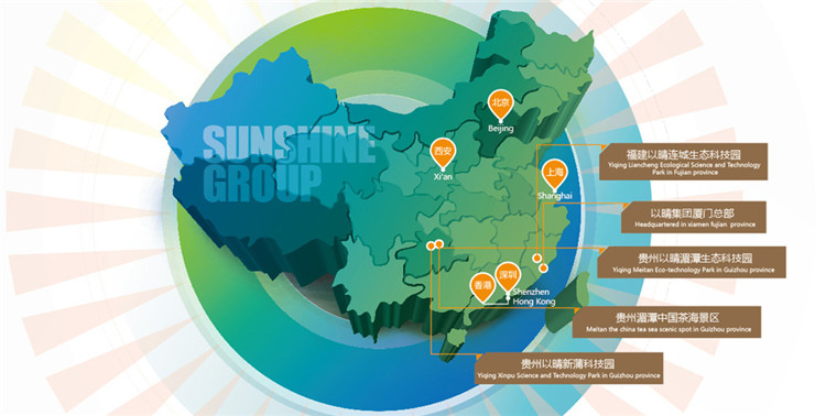目前已發展成為以廈門為中心,以福建以晴連城生態科技園、貴州以晴湄潭生態科技園、貴州湄潭中國茶海景區、貴州以晴新蒲科技園為產業支撐,以北京、上海、西安、深圳、香港為研發和銷售網點,形成覆蓋全國、面向全球的產業格局。