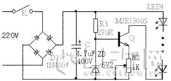 本文先從采用恒流源的電路開始,本電路中的主要元件三極管,要求其耐壓要400V以上,功率也要10W以上的大功率管,如MJE13003、MJE13005等,并且要加上散熱片,濾波電容C容量為4.7uF,耐壓要有400V以上,發光管電流的大小由R2調整決定,為方便調整可用可變電阻調整后再換上相同阻值的固定電阻,本電路可帶發光管數量少則十幾只,最多可達到90多只,雖然增加了一些成本,但使用效果要比只用電阻限流的電路好得多,即使電壓波動較大,電路仍然能保持電流恒定不變,這對發光管的壽命是非常有利的,在此范圍內的電流都能基本保持恒定不變。本電路使用發光管數量也不可太少,越少其效率也越低。本電路總耗電功率約6W。