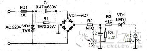 由于電容降壓電源是一種非隔離式電源,在通電瞬間會產生很大的電流,也就是所謂的浪涌電流。此外,由于外界環境的影響(如雷擊) 電網系統會侵入各種浪涌信號,有些浪涌會導致LED的損壞。所以,要提供熱敏電阻保護,這個主要有負溫度系數熱敏電阻保護(NTC熱敏電阻,NTC是Negative Temperature Coefficient的縮寫)和正溫度系數熱敏電阻保護(PTC(Positive Temperature Coefficient))然后有瞬態電壓抑制器保護((Transient Voltage Suppressor),簡稱TVS)