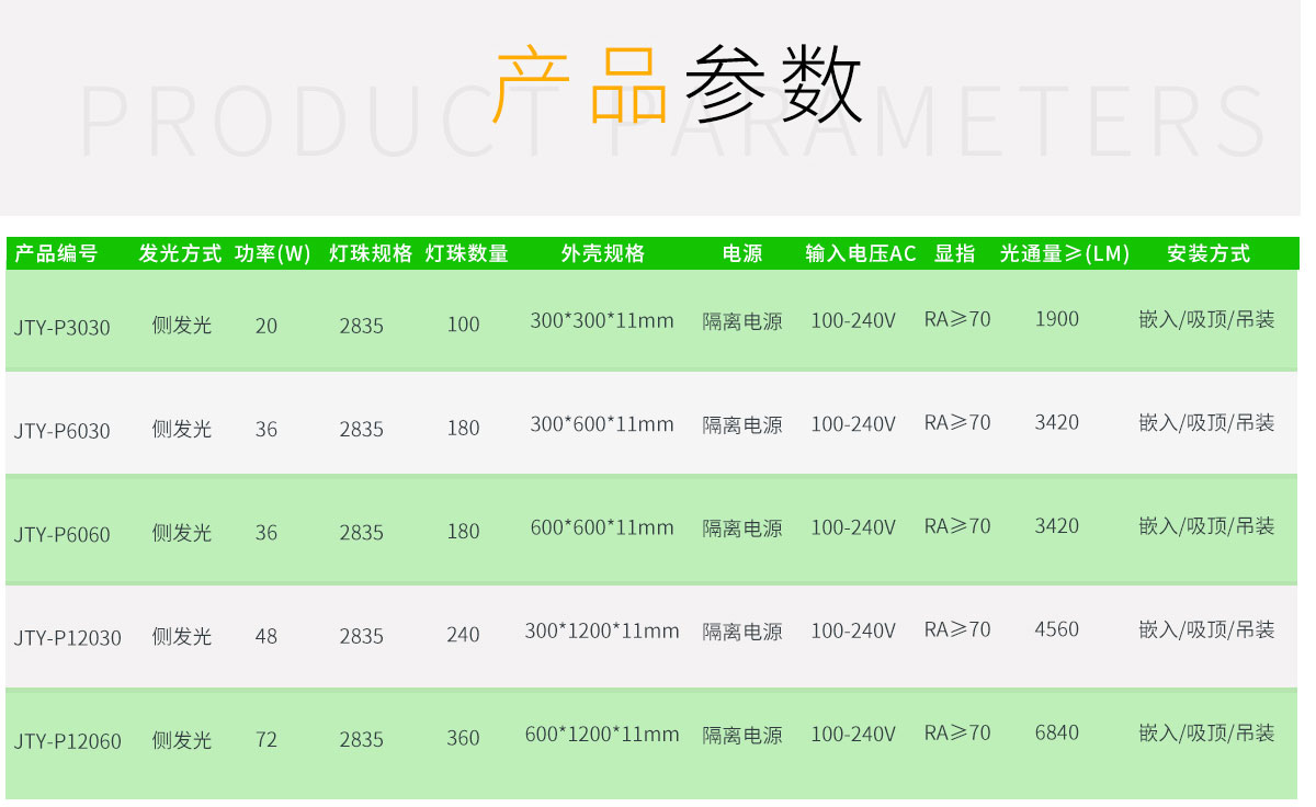產品編號 發光 方式 功率(W) 燈珠 規格 燈珠 數量 外殼規格 電源 輸入電壓AC 顯指 光通量≥(LM) 安裝方式