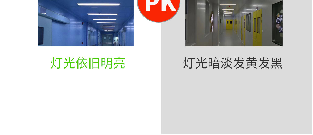我司凈化燈所采用的燈珠,均是由臺灣進口LED晶元芯片制作而成,燈具整體設計緊湊、外形美觀大方、無頻閃、光線柔和、顯色指數高,接近自然光,燈體采用鋁合金散熱,兩端絕緣處理,不積塵、不藏塵、易清潔、能滿足10/100/1000/10000級凈化要求,安裝使用方便,與普通燈相比,保持同等照度下節電率超過50%,壽命是普通燈管的5倍以上,不用啟輝器、不需外置鎮流器,大大減少了故障因素,使用過程中幾乎免維護,是醫院、藥廠、車間、實驗室的最佳選擇。